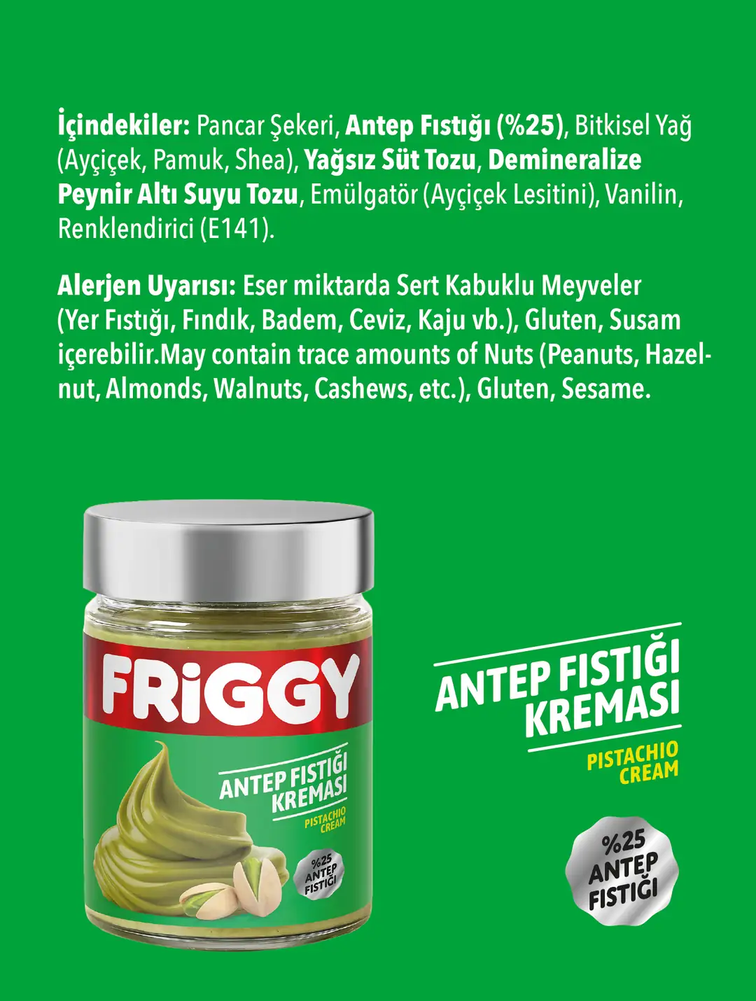 %25 gerçek Antep fıstığı ile hazırlanan FRIGGY Antep Fıstığı Kreması, yoğun kıvamı, doğal yeşil tonu ve zengin aromasıyla lüks pistachio lezzetini günlük tüketilebilir bir forma taşıyor.