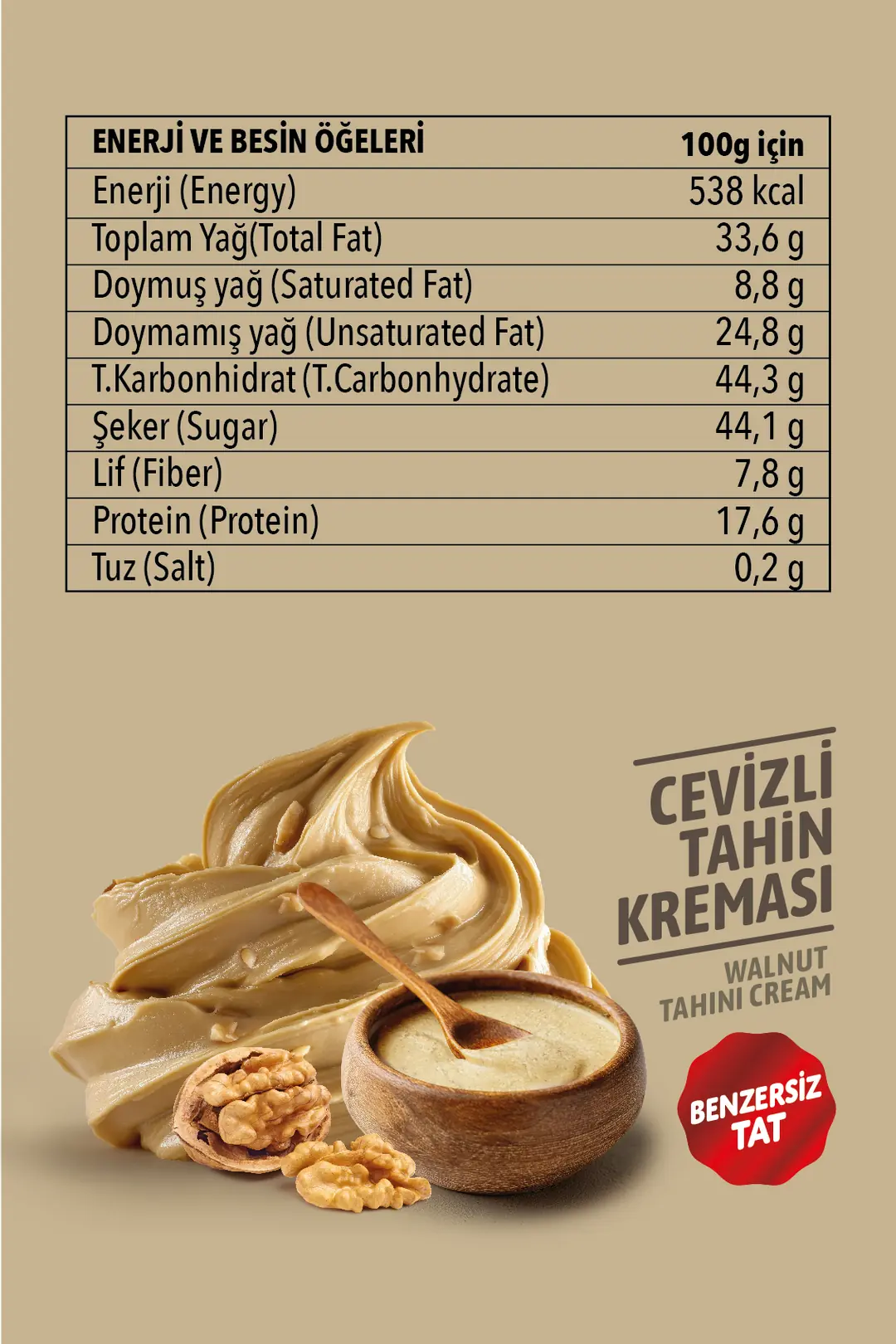 Tahinin kendine has aroması ve ceviz parçacıkları bir araya gelerek hem kahvaltılarda hem tatlı tariflerinde hem de ara öğünlerde unutulmaz bir lezzet deneyimi oluşturuyor. 320 g cam kavanozda tazeliğini korur ve premium görünümüyle dikkat çeker.