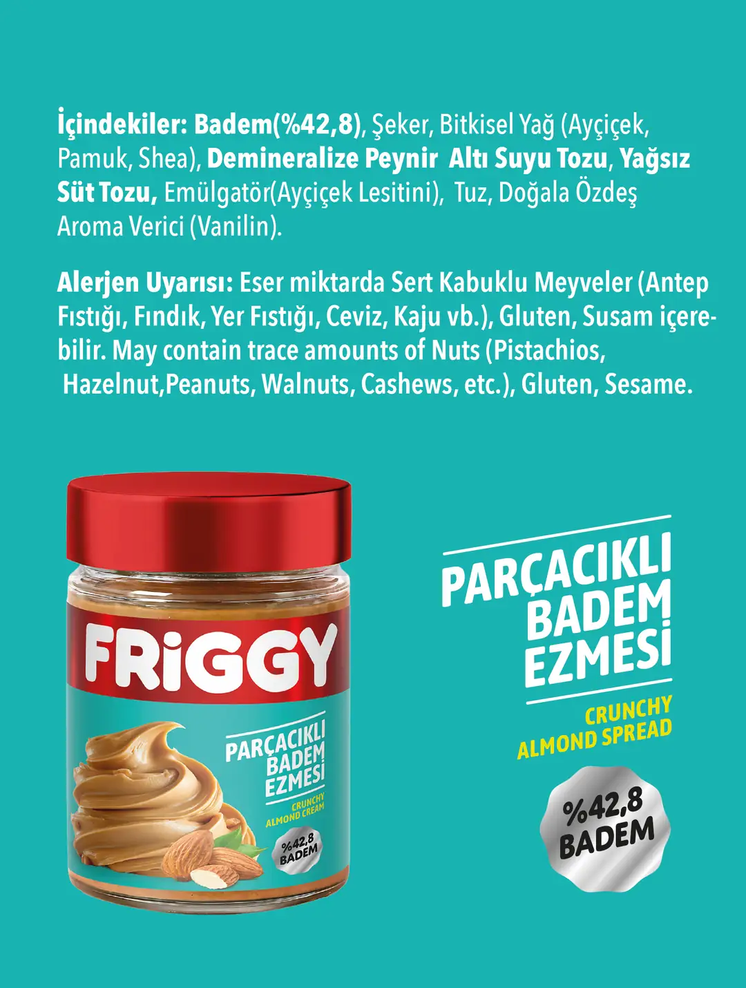 %42.8 gerçek badem içeriğiyle hazırlanan FRIGGY Parçacıklı Badem Ezmesi, katkısız, doğal ve yoğun aromalı yapısıyla bademin kendine özgü karakteristik lezzetini olduğu gibi yansıtır. Kıtır badem parçacıklarıyla zenginleştirilmiş bu ezme; sade, tok tutan ve besleyici bir alternatif arayanlar için mükemmel bir tercihtir.