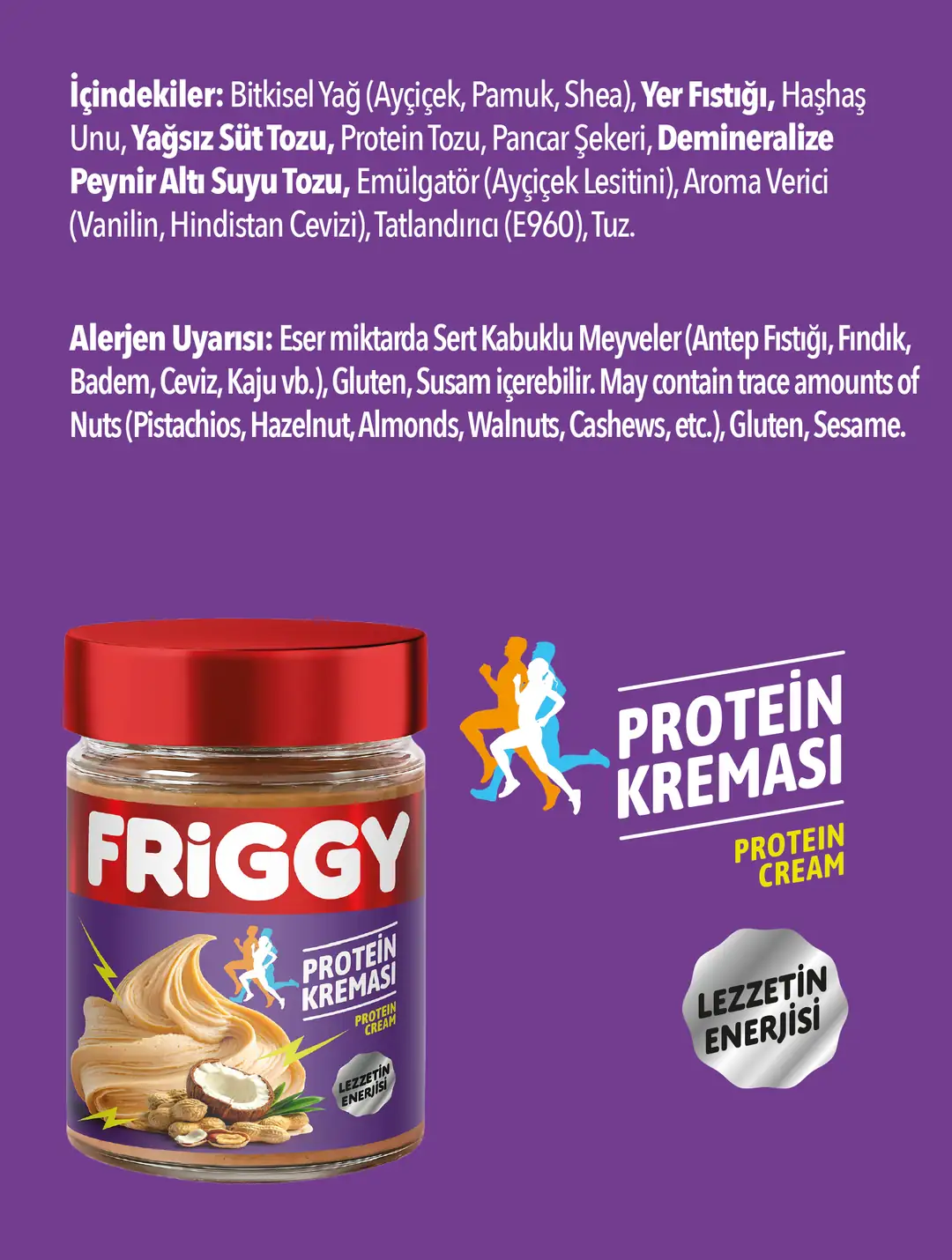 %28 yüksek protein içeriğiyle hazırlanan FRIGGY Protein Kreması, tatlı lezzetinden ödün vermeden güçlü bir enerji sunan özel bir formüle sahiptir. Hafif tatlı, pürüzsüz ve sürülebilir kıvamıyla hem sporcuların hem de günlük yaşamda enerjiyi yüksek tutmak isteyen herkesin favorisi olmaya adaydır.